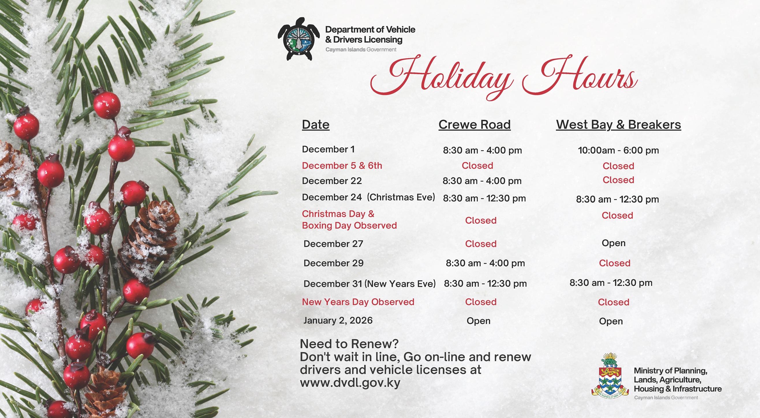 Customers are reminded that they may renew their driver’s licence and vehicle licence online at www.dvdl.gov.ky, offering a convenient alternative during the busy holiday period.